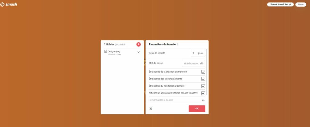 Non seulement tu pourras gratuitement envoyé des fichiers jusqu’à 50 Go mais les utilisateurs peuvent profiter de fonctionnalités avancées comme la protection par un mot de passe, les étapes de la procédure seront notifiées par email, et en plus tu pourras même configurer la durée de validité de tes liens. En plus chez Smash, chaque transfert de fichiers peut être personnalisés au niveau du design, grâce à la possibilité de rajouter son logo et son fond d’écran.
